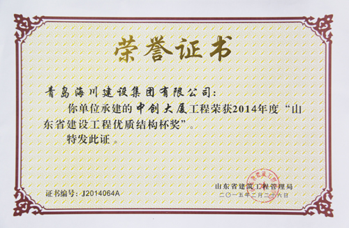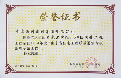 公司最近從省建筑工程管理局接連捧回四項(xiàng)省級榮譽(yù)證書,分別是:一分公司中創(chuàng)大廈工程榮獲“2014年度山東省建筑工程優(yōu)質(zhì)結(jié)構(gòu)杯獎(jiǎng)”,四分公司星光上院7#、8#住宅樓工程榮獲“2014年度山東省住宅工程質(zhì)量通病專項(xiàng)治理示范工程”。七分公司青島農(nóng)業(yè)大學(xué)新建科技實(shí)驗(yàn)樓工程接連榮獲“2014年度山東省建筑施工安全文明標(biāo)準(zhǔn)化優(yōu)良工地”和 “2014年度山東省建筑工程優(yōu)質(zhì)結(jié)構(gòu)杯獎(jiǎng)”兩項(xiàng)榮譽(yù)。